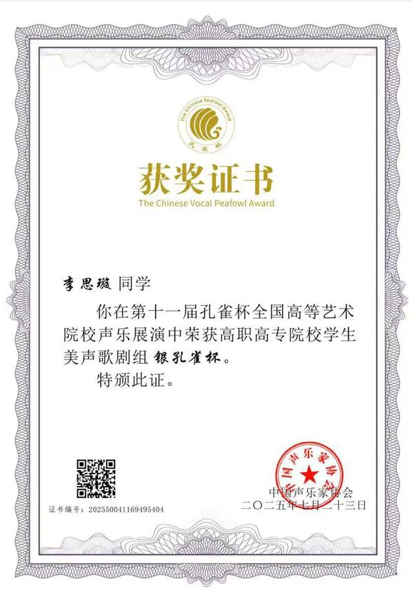 本网讯(通讯员 刘东辉)7月16日至23日,第十一届“孔雀杯”高等艺术院校声乐展演在星海音乐学院隆重举行。我校教育与艺术学院音乐学专业2301班学生李思璇(指导教师:覃沁)凭借出色表现,荣获高职高专院校学生美声歌剧组银孔雀杯。