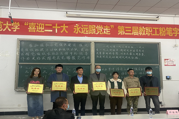 本网讯(通讯员 柯康敏)为庆祝党的二十大胜利召开,进一步推动校园文化建设,提高教师教学基本功,展示教师良好职业素养,10月20日下午,湖北师范大学举办了“喜迎二十大 永远跟党走”第三届教职工粉笔字比赛,来自各分工会共18位选手参加角逐。我校学工部王磊老师代表我校参加了此次比赛,荣获优秀奖。