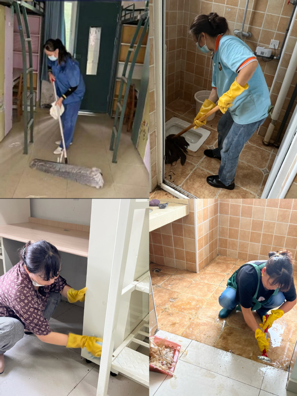 保洁人员全部投入到毕业生宿舍清理工作中。她们不怕脏不怕累,带上清洁工具,对宿舍地板、桌椅床铺、洗漱间、卫生间等进行全方位清洁,高质量完成毕业生房间清理工作。