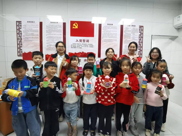 在航天小火箭手工制作环节,志愿者及社区工作人员提前为每位小朋友准备了丰富的手工材料,包括彩色卡纸、剪刀、胶水等。在志愿者的协助下,孩子们开始动手制作自己的小火箭。他们有的认真裁剪卡纸,有的小心翼翼地粘贴部件,还有的则发挥创意,为火箭添上了个性化的装饰。经过一番努力,一个个色彩斑斓、形态各异的会“飞”的航天小火箭在孩子们的手中诞生了,大家积极展示着自己的作品,脸上都洋溢着喜悦的笑容。