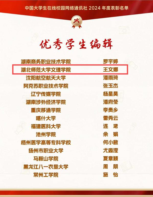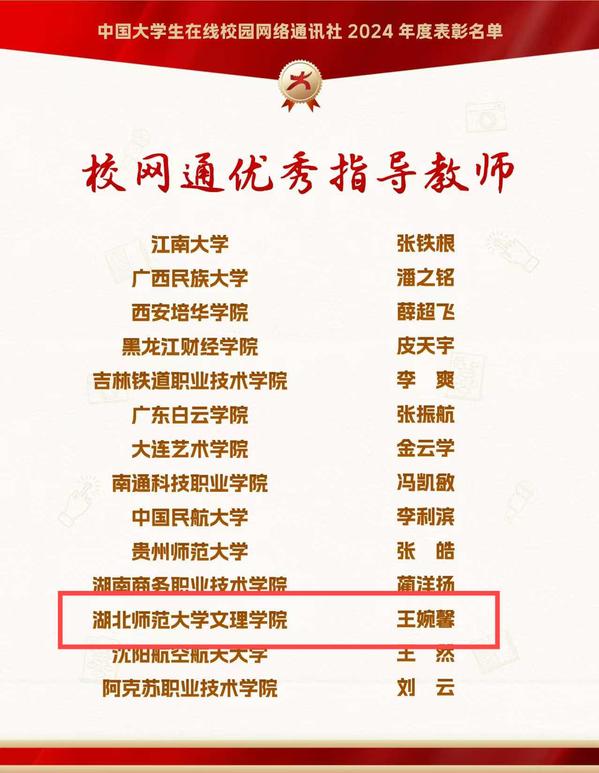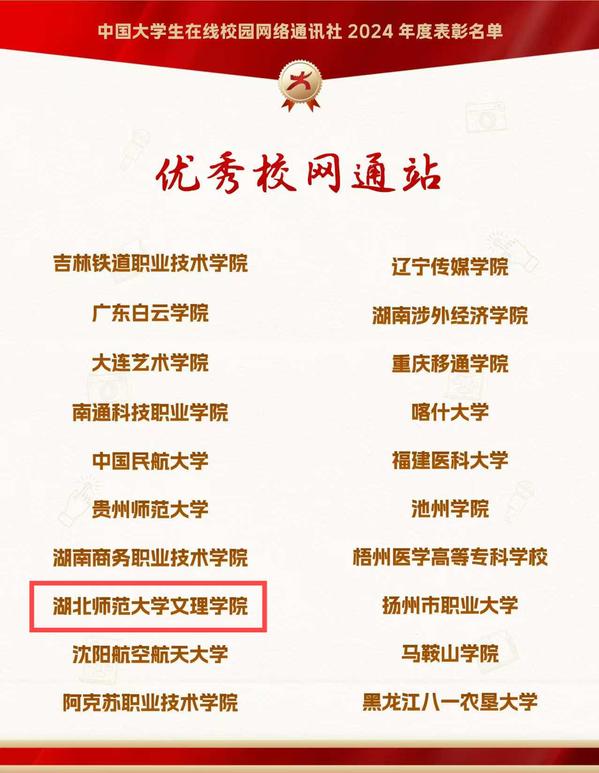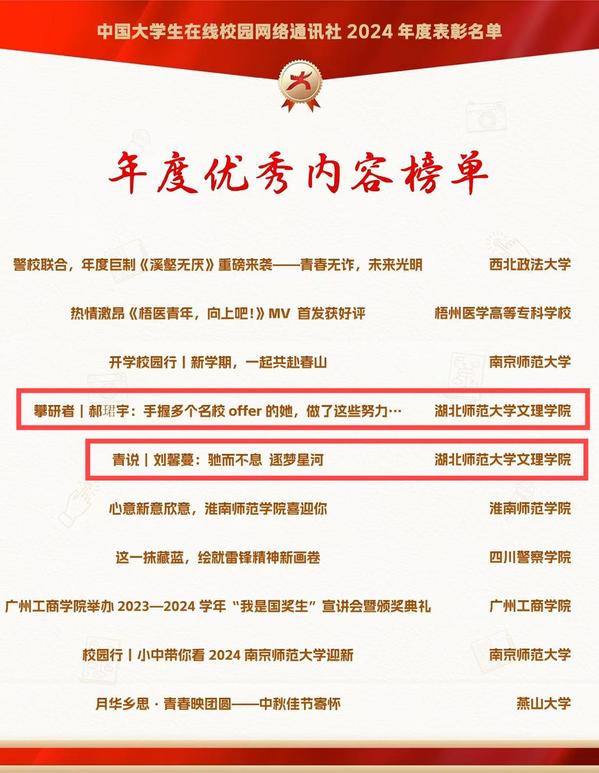 本网讯 12月26日,由教育部中国大学生在线评选的2024年度校园新媒体表彰名单正式公布,我校大学生记者团师生喜获“优秀校网通站”“优秀学生编辑”“校网通优秀指导老师”“年度优秀内容榜单”四项荣誉。