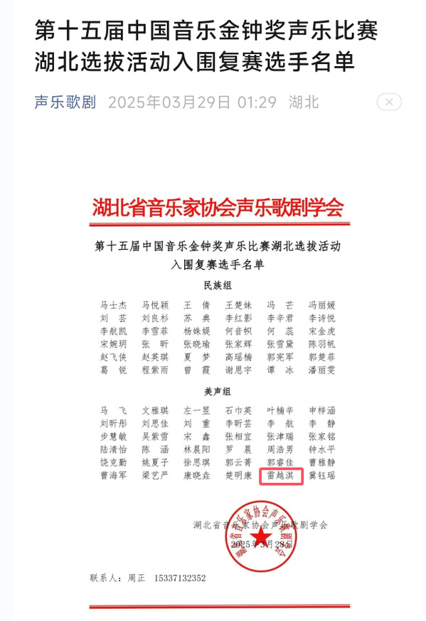 喜报|我校学子雷越淇入围第十五届中国音乐金钟奖湖北复赛