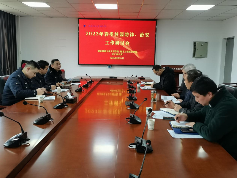 本网讯(通讯员涂亦乐)为了有效遏制春季开学电信网络诈骗的高发态势,提升预防电信网络诈骗的针对性和时效性,同时做好春季校园治安防范工作。2月21日下午,学校学工部、后勤保卫部联合汪仁派出所及湖北工程职业学院相关部门共同召开2023年春季校园“防诈、治安”工作研讨会,就如何预防电信网络诈骗和校园治安管理展开讨论。张志华副院长、汪仁派出所副所长李福奎、驻校民警刘天森、湖北工程职院学工部部长吴量、保卫处处长章泉及我校学工部和后勤保卫部相关负责人参加了会议。