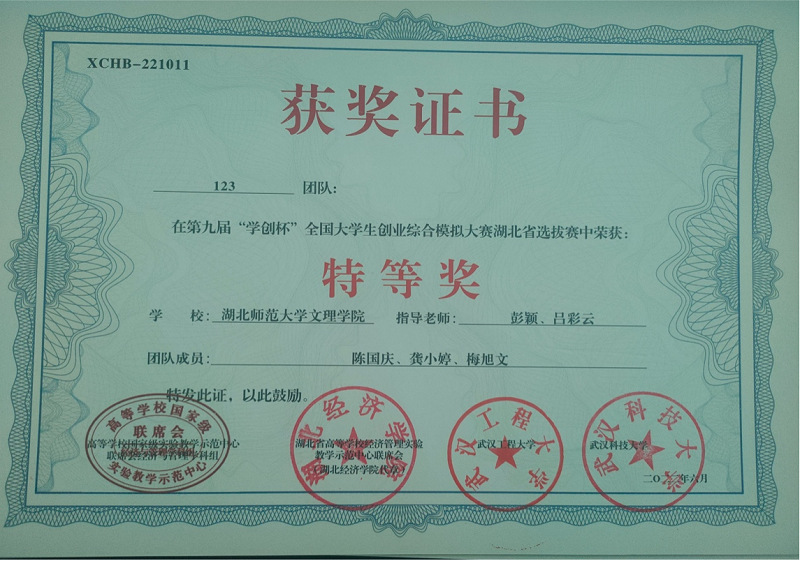 近日,第九届“学创杯”大学生创业综合模拟大赛湖北省赛在武汉工程大学和武汉科技大学圆满落幕,我校经济与管理学部陈国庆、龚小婷、梅旭文组建123团队在经济与管理学部彭颖和吕彩云老师的指导下,喜获大赛特等奖。