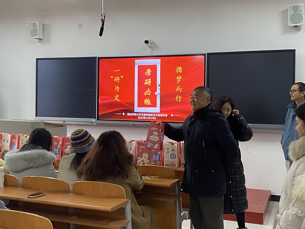 为切实缓解考研学子备考压力,鼓舞士气,坚定冲刺信心,12月18日上午10点,经济与管理学部于2号实验楼405教室开展了“一‘研’为定,循梦而行”考研慰问活动。学部主任商树松、党总支副书记罗铭、专业负责人葛子明等一行7位老师为即将踏上考研战场的学子送去温暖和祝福。