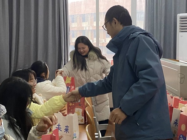 最后,为全体考研学子送上精心准备的“考研暖心包”——橙子寓意心想事“橙”,一战“橙”硕;薯愿寓意“薯”你最棒,如你所“愿”;士力架寓意“巧克”难题,能量满满;文具寓意“以笔为剑,乘风破浪”,每一个礼包上都张贴着老师们亲手书写的考研“祝福贴”,一字一句间都流露着学部满满的关切和真挚的祝福。