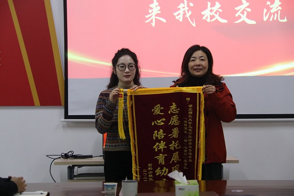 1210日上午9点,黄石市西塞山区石料山社区党委书记赵慧、党委副书记张晓萍、团委书记龚顺一行来到我校,给经济与管理学部送来了锦旗,感谢我校志愿者在暑期社会实践中的无私奉献和暖心服务。校党委书记杨邓红、校团委书记陈荟芸、经济与管理学部主任徐燕、党总支副书记罗铭等领导老师以及学生代表参加了赠旗仪式。
