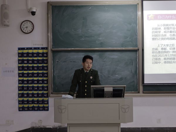 宣讲会上,退役士兵们凭借丰富的经验与深刻的感悟,对入伍要求、征兵流程、报名方式、优待政策以及各类注意事项进行了详细的讲解,让同学们对参军入伍的路径与保障有了清晰的认知。接着,通过分享各自在部队的服役经历,展现了当代大学生投身军旅、献身国防的壮志豪情与精彩历程。从艰苦的军事训练到紧急的任务执行,从个人意志的深度磨砺战友间的深厚情谊,一个个故事让在场的同学们深受触动。最会,在答疑环节,他们针对入伍过程中的相关问题,如体能训练提升策略、兵种选择、在部队考学提干等,给予了耐心且专业的解答,进一步消除了同学们心中的疑虑。