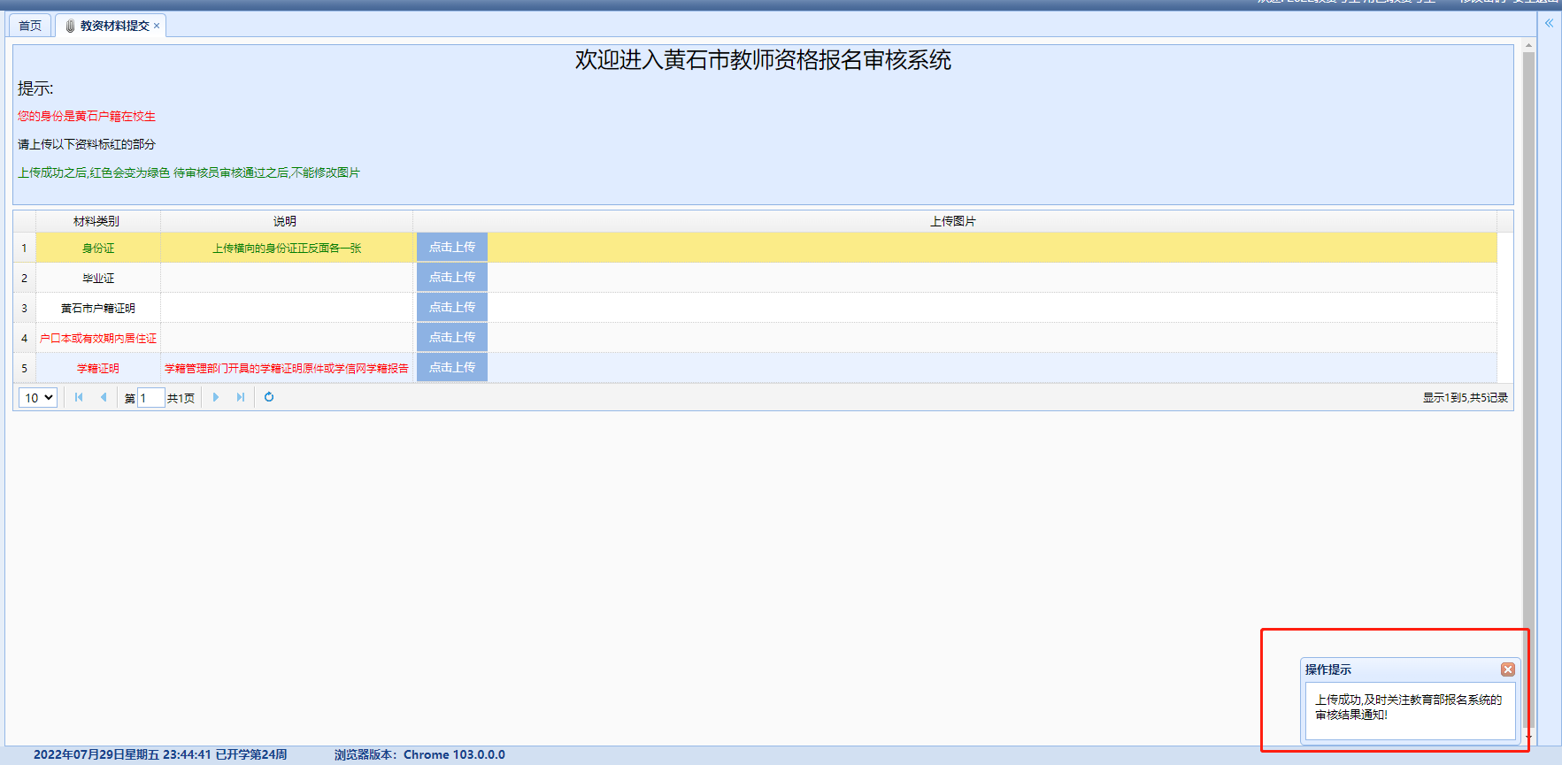 注意:请各位考生上传材料到黄石市教师资格报名审核系统后,务必返回在中国教育考试网(ntce.neea.edu.cn)中查看审核状态。如审核状态为“不通过”,请重新提交报考信息,等待审核。否则审核系统中因看不到您的报考信息,无法审核。