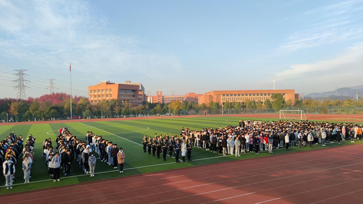 2021年11月15日早上七点,理工学部1100名师生在田径场举行庄严的升旗仪式。伴随着晨风,迎着朝霞,升旗仪式正式开始,校国旗班的同学气宇轩昂,踏着整齐的步伐护送国旗走向升旗点。伴随着雄壮的《义勇军进行曲》,五星红旗冉冉升起,全体师生怀着无比崇敬的心情,庄严肃立,行注目礼,表达了全体师生坚定听党话,感党恩,跟党走的理想信念。