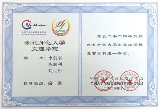 理工学部李剑宇、陈顺利、刘世乐三位同学在2024年高教社杯全国大学生数学建模竞赛中荣获本科组一等奖!