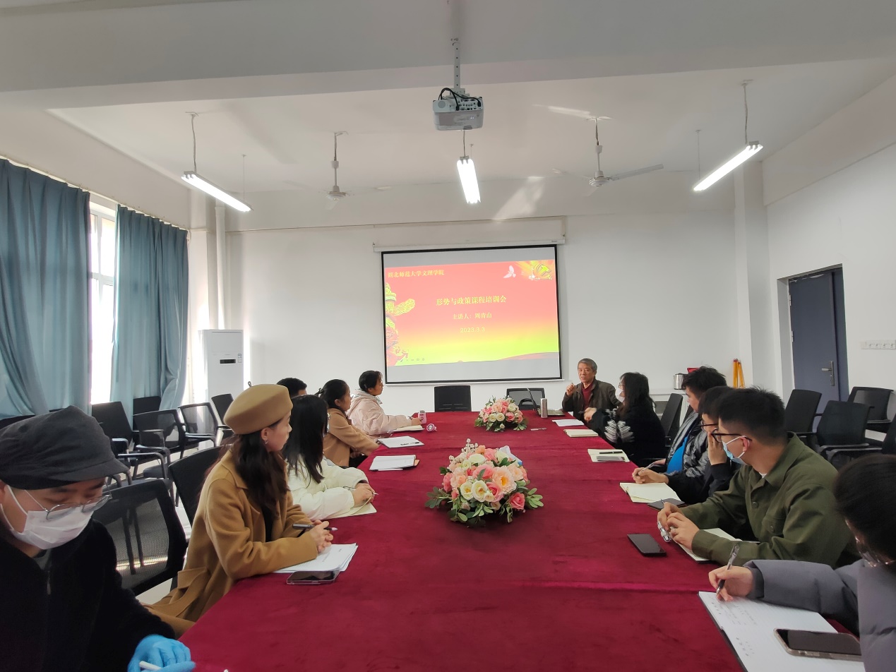 为切实提高形势与政策课教学质量,确保本学期形势与政策课教学工作的顺利开展,33日下午,马克思主义学部在3号实验楼508会议室召开2023年春季学期形势与政策课教师培训会。此次会议由马克思主义学部主任周青山主持,学校全体形势与政策课教师参会。