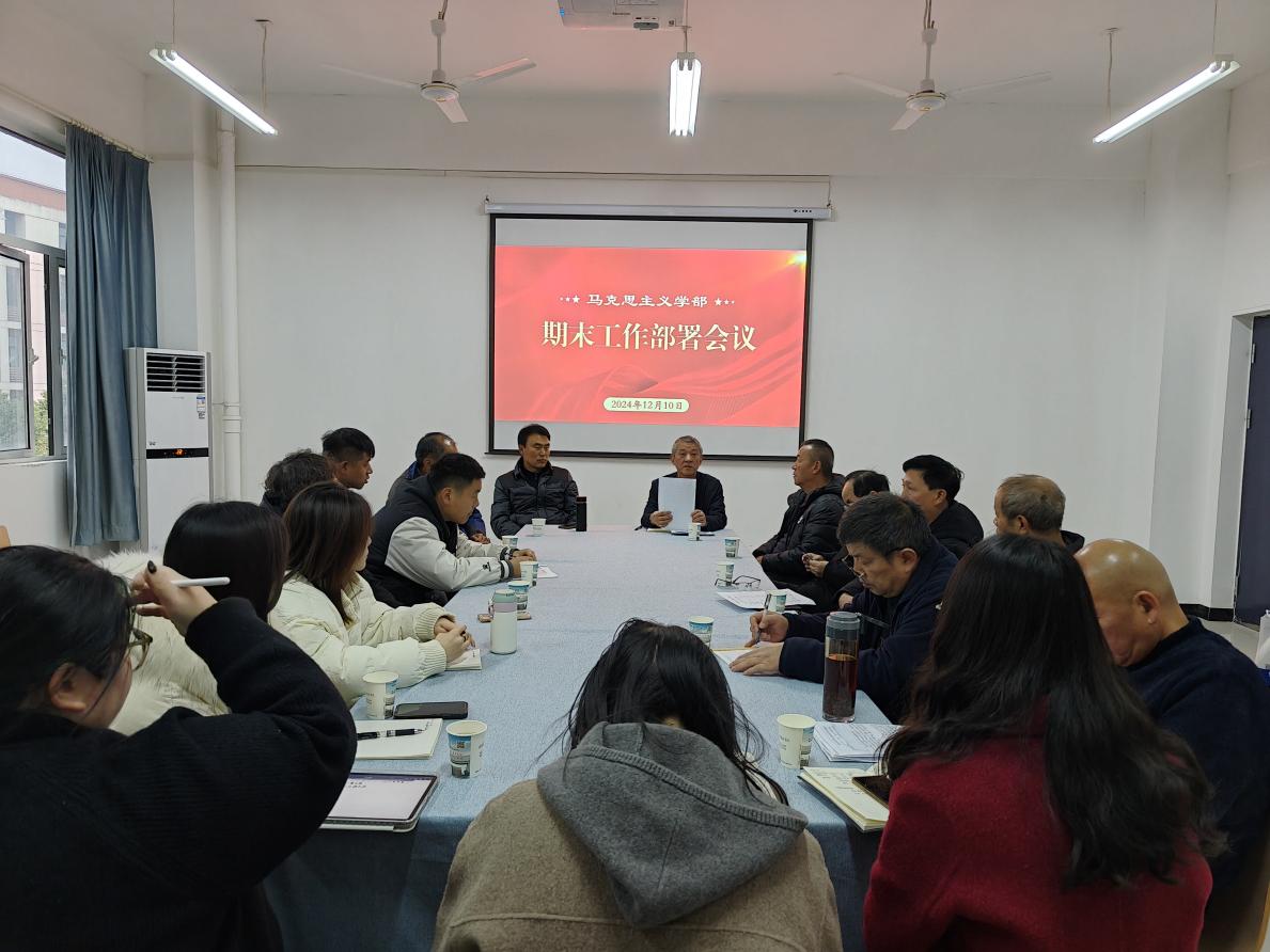 20241210午,马克思主义学部在3号实验楼208议室召开期末工作部署会,学部全体教职工参加学部主任周青山主持会议