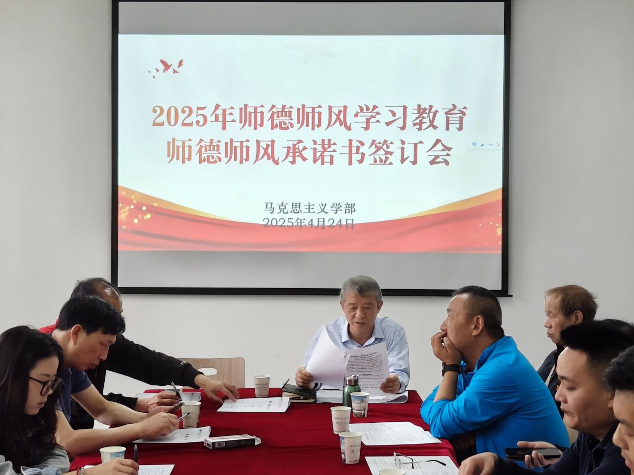 2025年4月24日上午,马克思主义学部在3号实验楼208会议室开展师德师风教育及师德师风承诺书签订活动,学部全体教职工参加,会议由学部主任周青山主持。