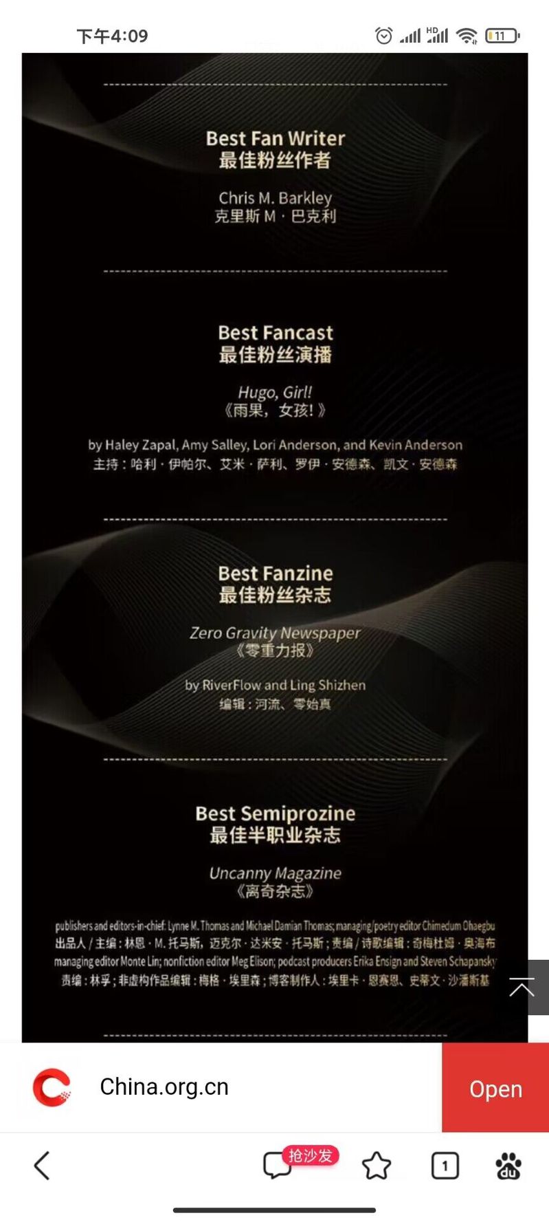 2023年第81届世界科幻大会于10月18日至22日在成都科学馆举行,世界科幻大会由世界科幻协会主办,是全球最受瞩目、历史最悠久、规模和影响力最大的科幻文化主题活动,2023年首次在中国举办。此次大会评选出17个雨果奖奖项和惊奇奖、北极星奖等荣誉,我校人文学部中文专业2205班学生温卓峰主编的科幻杂志《零重力报》获得“最佳粉丝杂志”的荣誉称号,《人民日报》、中国网、央视网等多家媒体杂志都进行相应报道。http://m.app.china.com.cn/english/template/displayTemplate/news/newsDetail/9000050/116765845.html?isShare=true