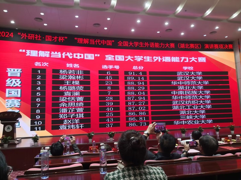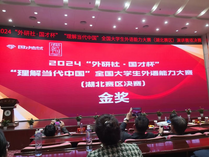 2024年11月9日,我校人文学部邓薇薇老师带队三位选手赴湖北大学参加“外研社-国才杯〈理解当代中国〉演讲比赛省赛”,人文学部英语专业苗盛同学在邓老师、兰铭瑶老师全方位悉心指导和陈杨等老师配合指导下,过五关斩六将,比赛出色发挥,经过首轮即兴演讲激烈PK,从湖北省200多名选手的省赛初赛中脱颖而出,冲进了省赛决赛,这已经是我校该项比赛的历史性突破。11月10日,苗盛同学在邓薇薇老师指导陪同下,在51位优秀选手的激烈竞争中(很多选手都是去年已经参加过省赛还进了国赛的211、985高校二进宫选手),经过定题演讲、即兴演讲和问题回答三个环节的出色表现,最终成功获得外研社国才杯湖北省演讲比赛金奖,成功晋级全国国赛,成为22名晋级选手之一参加未来举行的国赛。苗盛同学是湖北省所有民办高校中唯一晋级国赛的选手,创造了民办高校奇迹!此次比赛是我国演讲比赛最高赛项。另外,商务英语专业詹雄滨同学也发挥出色,获得了省级铜奖。
