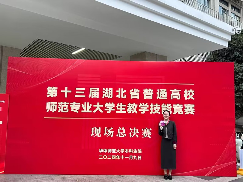 2024年11月9日,第十三届湖北省普通高校师范专业大学生教学技能竞赛决赛在华中师范大学举行,此次共有70名选手入围决赛,经教学设计、课件制作、即席讲演和模拟上课·板书环节的激烈角逐,由我校人文学部徐唱、陈杨2位老师指导的英语2101班范瑶同学取得优异成绩,获得高中英语组一等奖第一名(该组一等奖仅2名)。