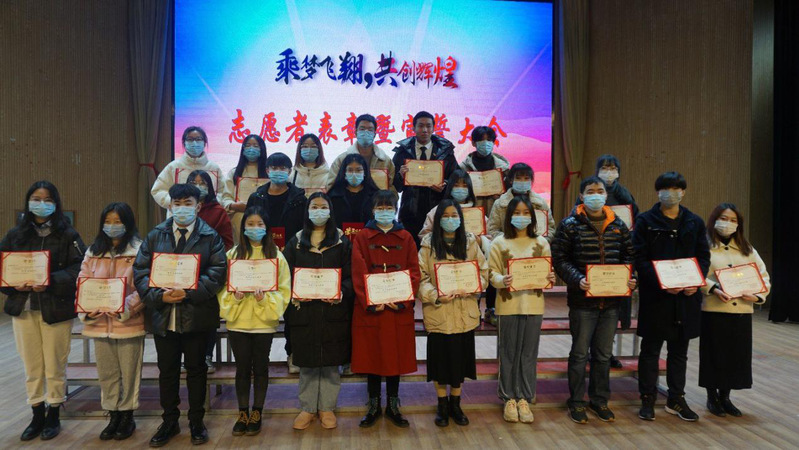 (通讯员:刘萍萍)2020年12月3日中午12:00,我校在风雨操场二楼举办第五届志愿者表彰暨宣誓大会。全国三八红旗手、全国首批优秀五星级志愿者、上榜中国好人榜、爱心满园义工协会负责人肖祖红、教育与艺术学部党总支书记李先华、理工学部党总支副书记肖圣芳、校团委书记陈小龙、教育与艺术学部团总支书记尹誉霖、理工学部团总支书记董诗琪共同出席了此次大会。 本次大会旨在迎接第35个“12.5”国际志愿服务日,在嘹亮的国歌声中大会拉开帷幕。会议伊始,由校青协会长杨郝薇做年度工作汇报,全体人员一同观看青协志愿者服务视频回顾。陈书记上台宣读表彰决定,由主持人宣读获奖名单,并邀请优秀志愿者代表、优秀抗疫志愿者代表、优秀志愿工作者代表和优秀学部青支队上台领奖。优秀青支队代表彭少勃和优秀抗疫志愿者代表李政上台发言,他们表示作为志愿者应为校争光,为人生添彩。宣誓大会上,嘉宾肖祖红女士作精彩发言:勉励当代大学生心系祖国,积极走入社会,服务社会,在志愿服务中不断进步,最后志愿者宣誓并签字。 本次大会积极响应当代社会践行志愿服务精神的号召,青协志愿活动强有力地提升我校无私奉献的社会形象,更加鼓舞我校学子参与志愿服务活动,充分发扬志愿者服务精神,传播社会主义核心价值观。