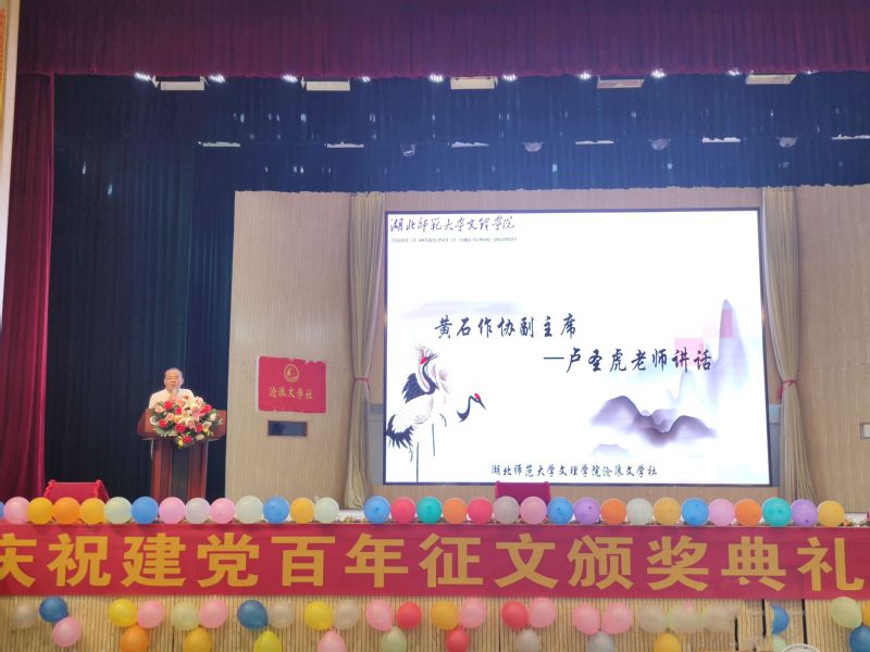 2021年6月8日中午12点,“建党百年征文颁奖典礼暨沧浪文学社第三十期期刊发布会”在风雨操场二楼隆重举行。黄石作协副主席卢圣虎、相关领导、部门负责人出席。黄石其他三所高校文学社团代表共计20人、校内学生代表200余人参会。