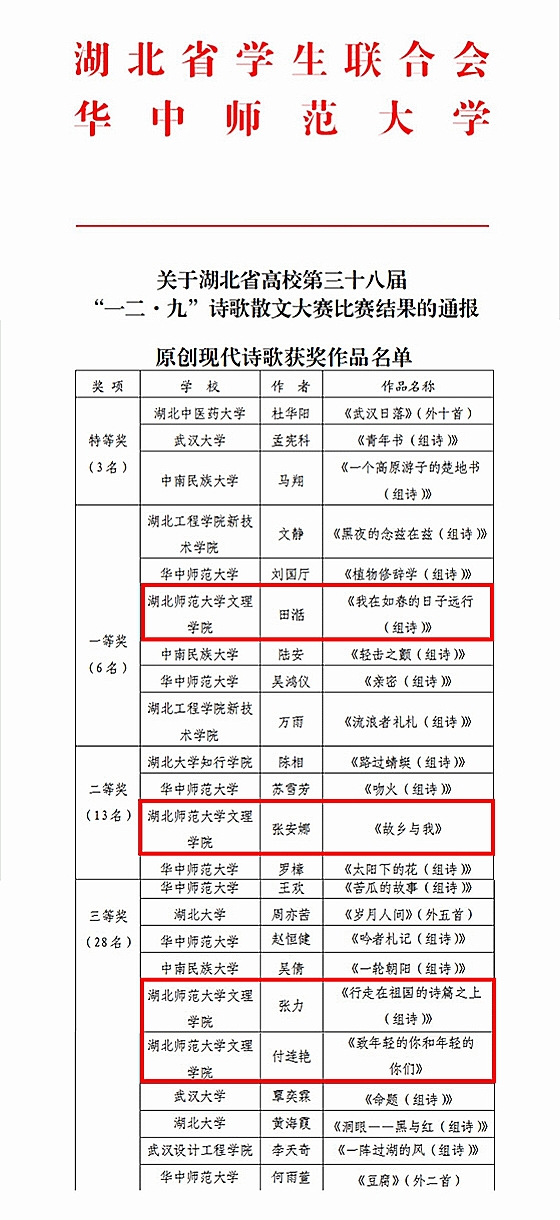 (通讯员:苏祎)2023年3月15日,湖北省学生联合会、华中师范大学联合举办的第三十八届“一二·九”诗歌散文大赛赛事结果已公布。我校田湉荣获一等奖,张安娜荣获二等奖,张力、付连艳荣获三等奖。