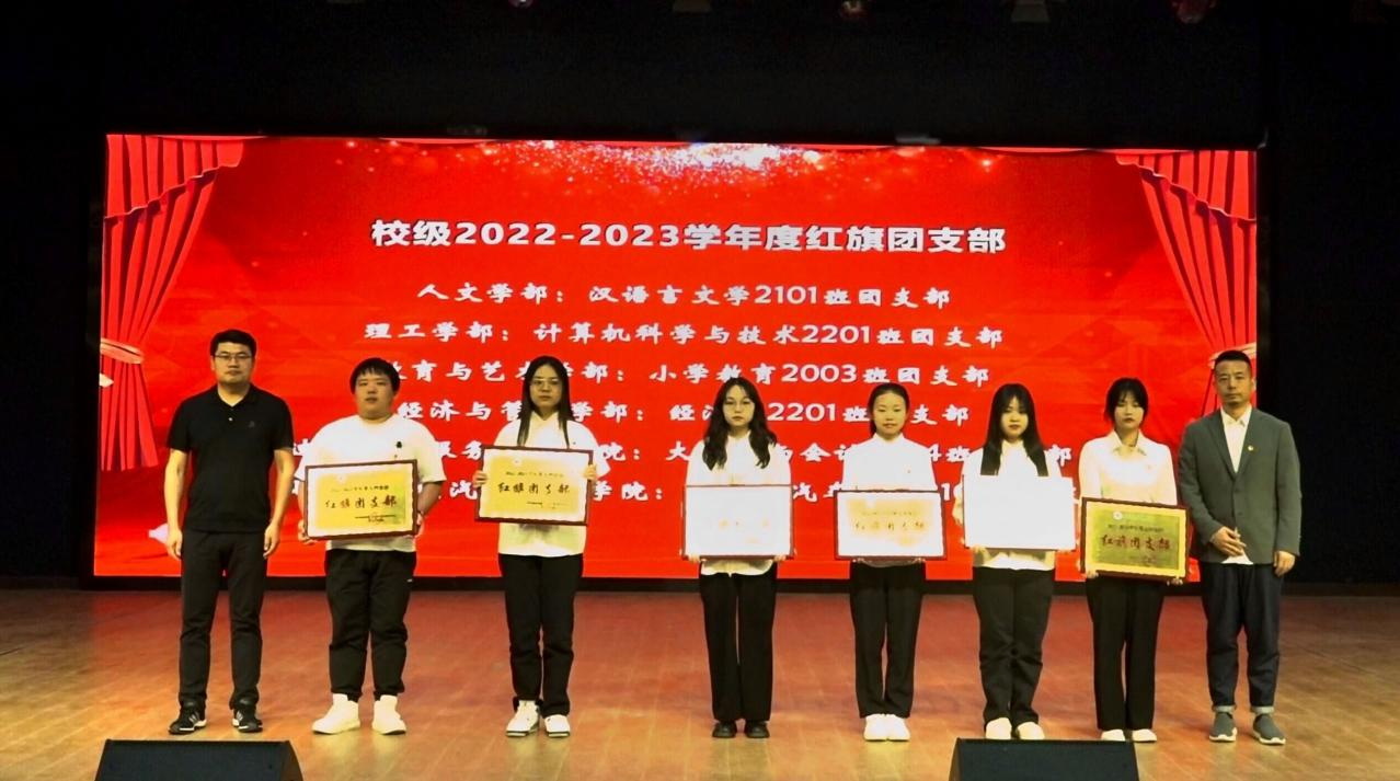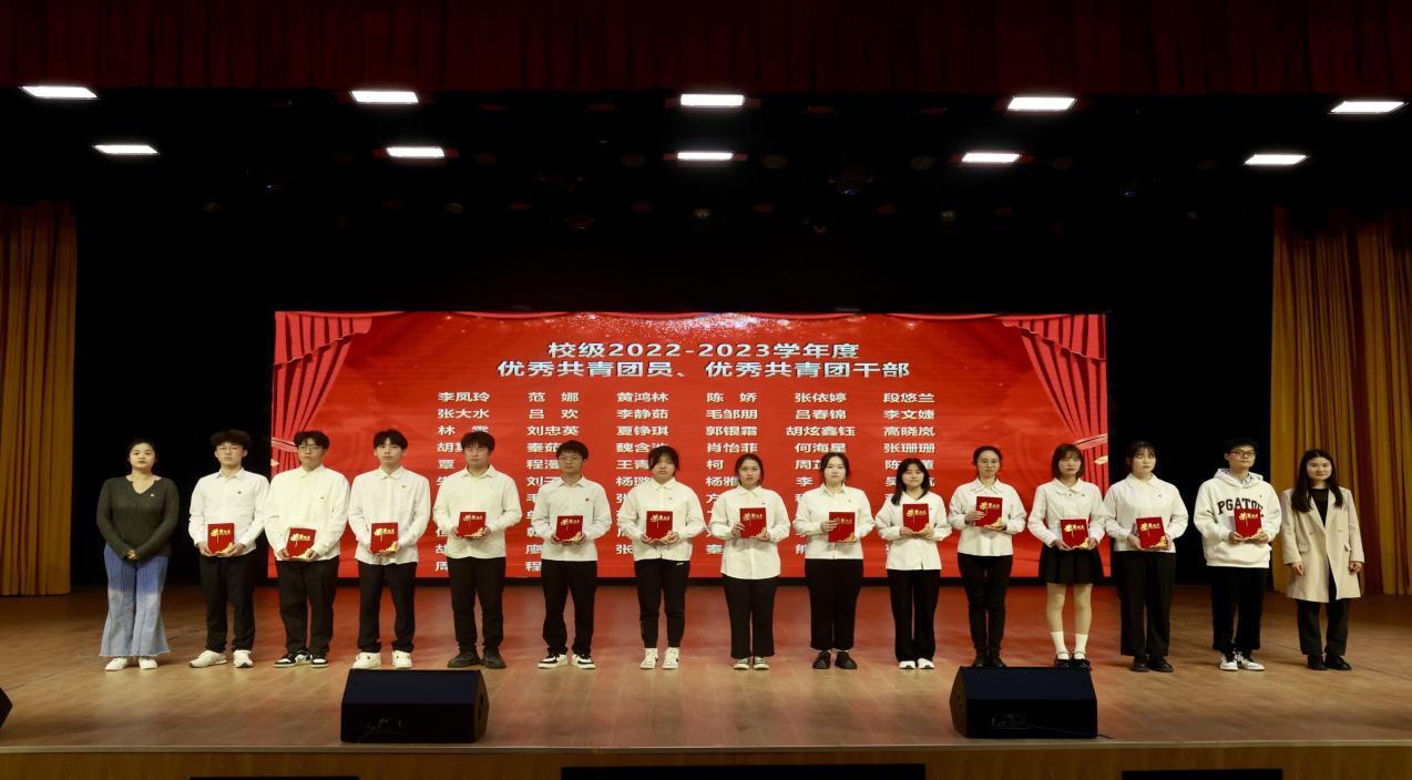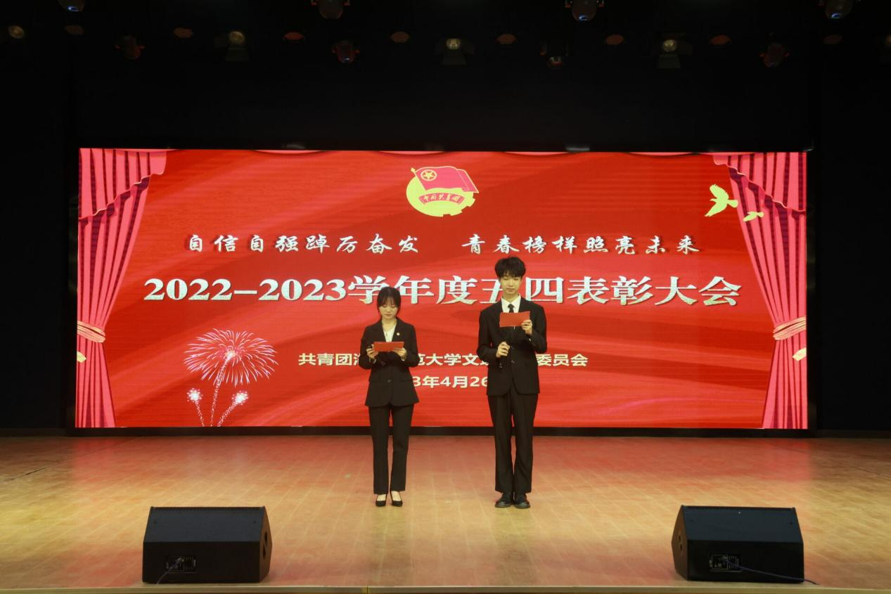 大会第五项,团委书记陈荟芸宣读关于表彰2022-2023学年度共青团先进集体和个人的决定。她宣读校团委决定授予人文学部五四红旗团总支荣誉称号,授予汉语言文学2001班团支部等6个团支部五四红旗团支部荣誉称号,授予程漫清等266名同学优秀共青团干部荣誉称号,授予陈董等357名同学优秀共青团员荣誉称号。同时她号召全校各级团学组织和团员青年以他们为榜样,坚定共产主义理想信念,自觉以实现中华民族伟大复兴为己任,为学校发展作出更大的新的贡献。