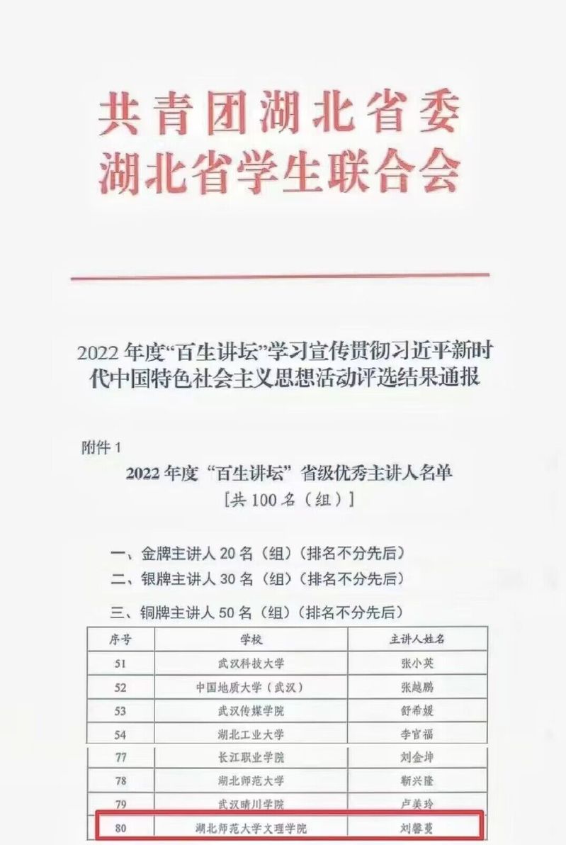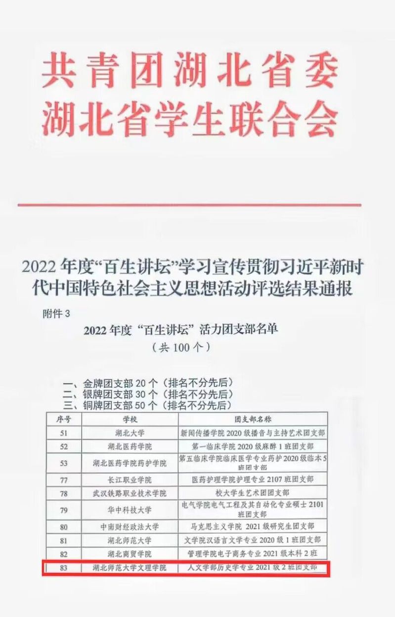 (通讯员:张清)2023年5月,由团省委、省学联开展的“百生讲坛”思想活动评选结果已公布。我校刘馨蔓同学、人文学部历史学专业2021级2班团支部分别荣获2022年度“百生讲坛”省级铜牌主讲人称号、省级铜牌团支部称号。