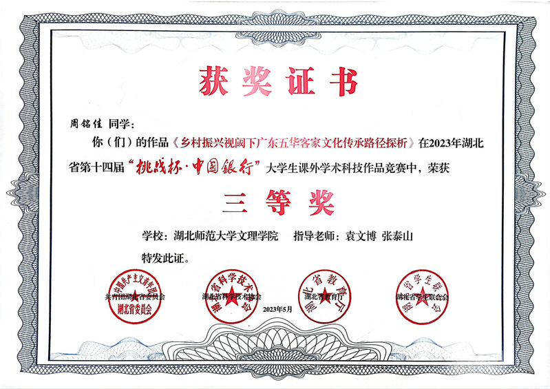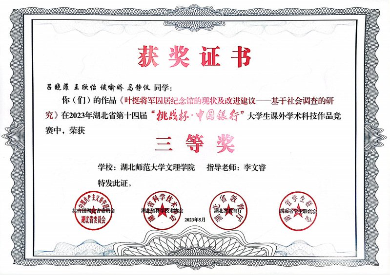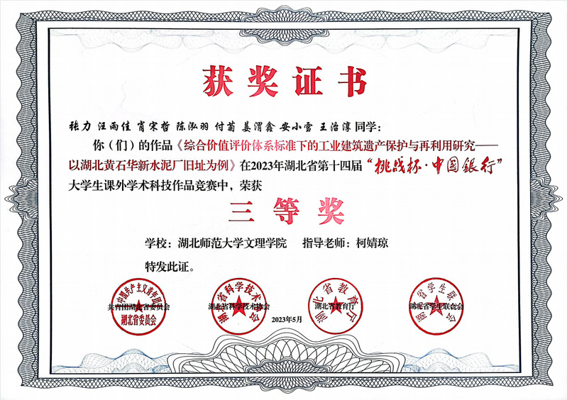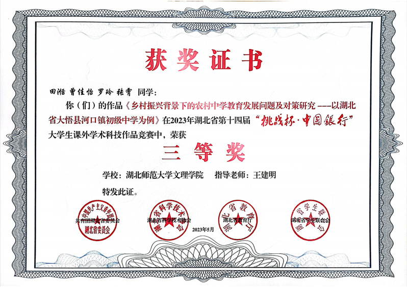 (通讯员:苏祎)5月23日,在团省委、省科协、省教育厅、省学联共同主办的湖北省第十四届“挑战杯•中国银行”大学生课外学术科技作品竞赛中,我校四个项目荣获三等奖!
