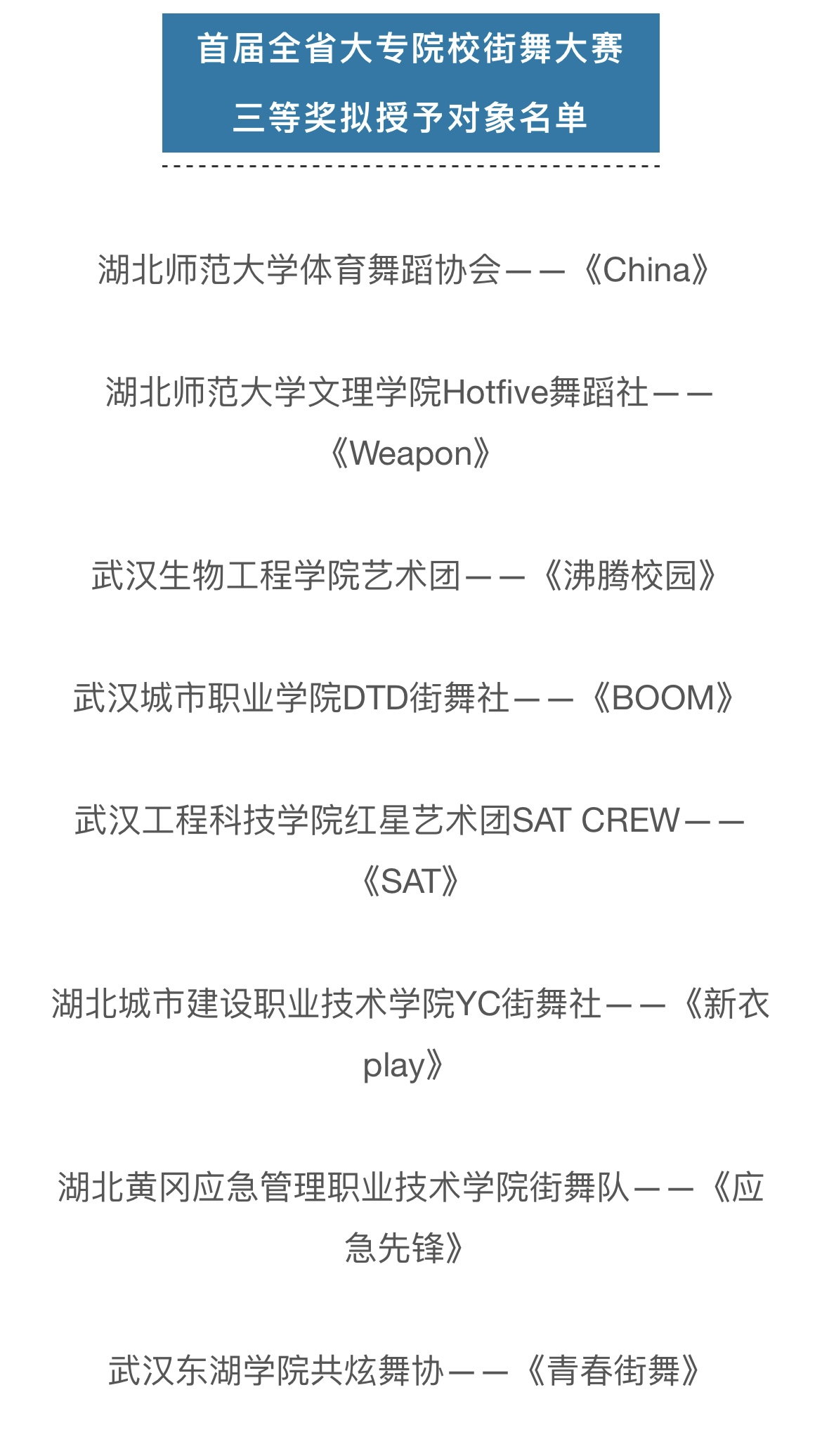 (通讯员:苏祎)引领新风尚,欢悦新时代。9月10日,首届全省大专院校街舞展演在黄冈市遗爱湖公园举办。我校代表队“Hot Five舞蹈社”的舞蹈作品《weapon》在此次比赛中荣获三等奖。
