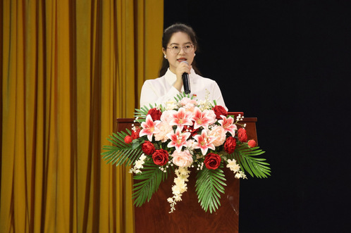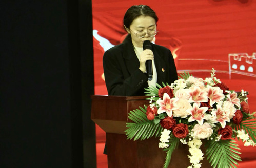 大会第三项,学生代表张燕上台发言。她主张,作为新一代青年,我们应在青春年华奋发向前,让青春在党和人民最需要的地方绽放璀璨之光。身为新时代的青年一代,我们应秉持发展之道,追求理想;勤学技艺,勇于创新;持续奋斗,肩负重任。