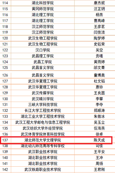 2020年8月26日,湖北省2019年度“大学生自强之星”评审结果公示,我校人文学部陈天成同学榜上有名,获评湖北省“大学生自强之星”。