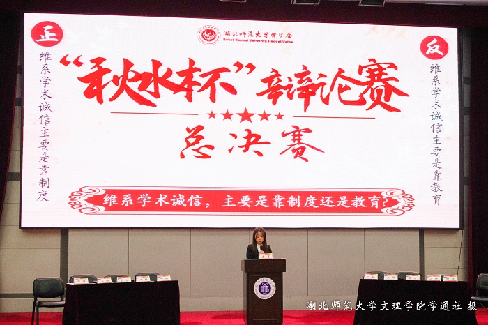 我校参加总决赛的四位辩手是吴明月、王秀静、叶妙、曾佳宜,她们和湖北师范大学马克思主义学院代表队分别作为正反双方,就“维系学术诚信主要是靠制度还是教育”这一辩题展开了激烈的争锋。针对辩题,双方在对辩、盘问和自由辩论环节都展开了激烈的攻辩。比赛中,双方辩手以良好的风范、出色的口才、敏捷的思维令全场观众为之折服,为之喝彩。