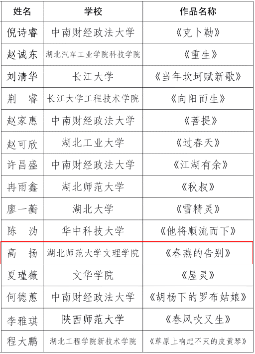 近日,湖北省第十九届“福创杯”新青年小说大赛获奖名单出炉。经过评委层层筛选,我校高扬和施雨涵两位同学荣获大赛二等奖,熊子延教授获得优秀指导老师奖。