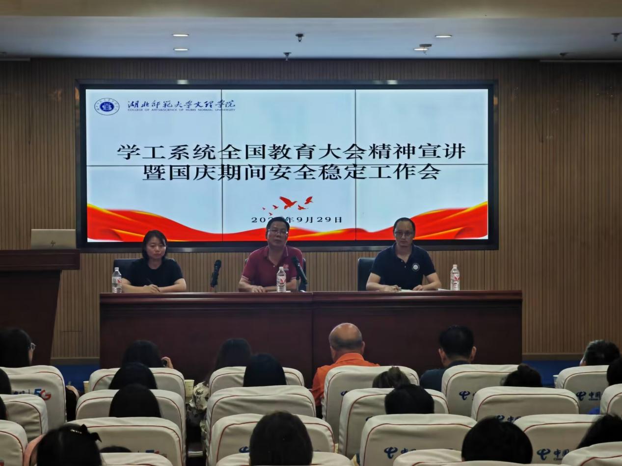 9月29日下午两点半,我校在图书馆报告厅召开全国教育大会精神宣讲暨国庆期间安全稳定工作会议。校党委副书记杨之毛、学工部部长汪崇文、心理中心主任陈庆、各教学单位分管学生工作书记(副书记)以及全体辅导员老师参加。会议由学工部部长汪崇文主持。