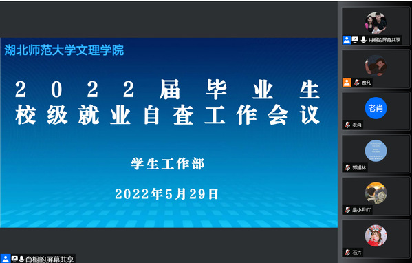 会上,肖劲光副部长详细介绍了2022届毕业生校级就业自查工作安排和要求,各学部针对就业核查相关问题进行了在线交流。