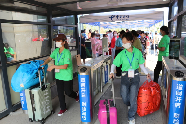 靠近大门,一群志愿者热情而至,一句欢迎,一句问候,扫去了旅途的疲惫;量体温,查看健康码、行程码,让人倍觉安心;热情的引导,真诚沟通,有如家的感觉。