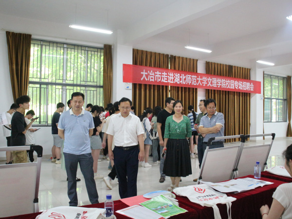 本网讯 (通讯员 肖劲光 拍摄 梁宏滨)为进一步促进我校毕业生高质量充分就业,深化政校企三方合作,6月13日下午,我校与大冶市人力资源与社会保障局、大冶湖高新技术产业开发区联合开展2023年“才聚荆楚·百县进百校”就业促进专项行动。校党委书记杨邓红、党委副书记杨之毛、副院长王胜国现场指导工作。