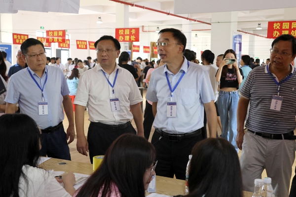 9月8日,湖北师范大学党委书记李宏,校长雷儒金,纪委书记陆咏梅,党委常委肖六亿,以及相关部门负责人来我校检查指导迎新工作,实地查看了各迎新点和新生宿舍,我校全体院领导以及相关部门负责人全程陪同。