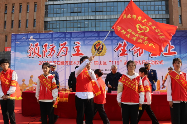 启动仪式上,举行了我校大学生消防志愿者成立暨授旗仪式,10名优秀大学生成为“青年大学生消防志愿者”,这是开发区·铁山区首批大学生消防志愿者。