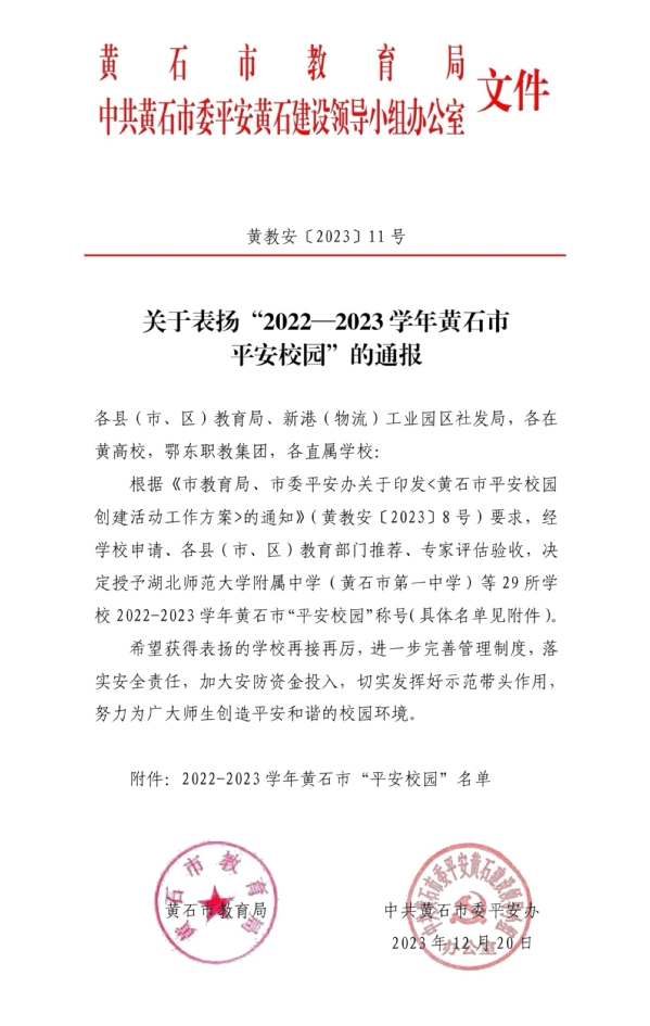 本网讯(通讯员 涂亦乐)根据黄石市教育局、中共黄石市委平安黄石建设领导小组办公室消息,我校喜获“2022-2023 学年度黄石市平安校园示范校”的荣誉称号。至此,我校已连续2年获评黄石市“平安校园”称号。