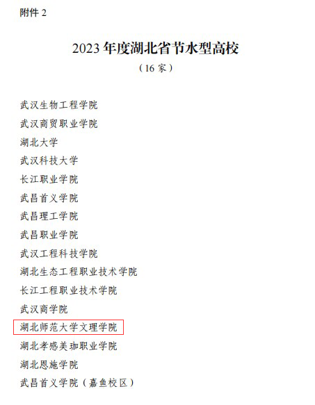 本网讯(通讯员 涂亦乐)近日,省水利厅、省发改委、省教育厅、省经信厅、省机关事务局联合下发文件,我校获评“2023 年度省级公共机构节水型单位”和“2023年度湖北省节水型高校”,湖北省仅有16家高校获评。