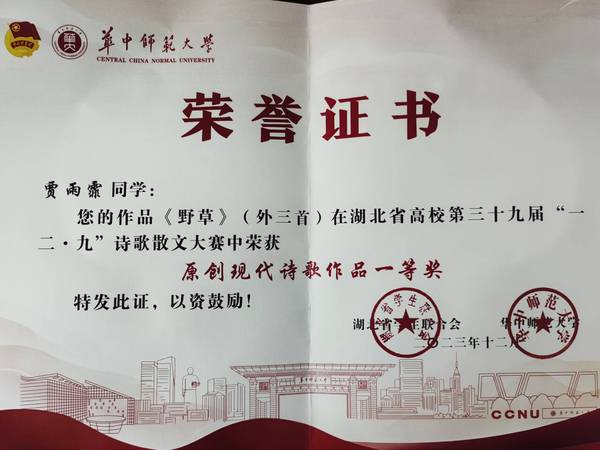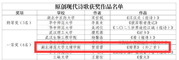 本网讯(通讯员 程胜伟)近日,湖北省高校第三十九届“一二·九”诗歌散文大赛组委会公布了第三十九届诗歌散文大赛的获奖名单,我校人文学部贾雨霏作品《野草》(外三首)荣获一等奖。