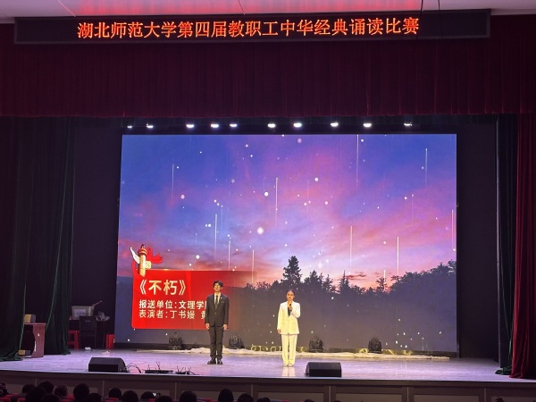 本网讯(通讯员 柯康敏)为传承弘扬中国优秀语言文化,提升教职工语言文化素养,12月12日下午,湖北师范大学举办第四届教职工中华经典诵读比赛,我校代表队在比赛中再获佳绩。教师丁书嫚、黄文杰诵读的作品《不朽》获比赛二等奖,教师边婷婷、唐晨、梅冰清、李雅欣诵读的作品《诗词里的中国》获比赛三等奖。