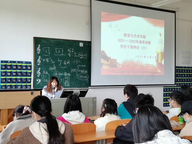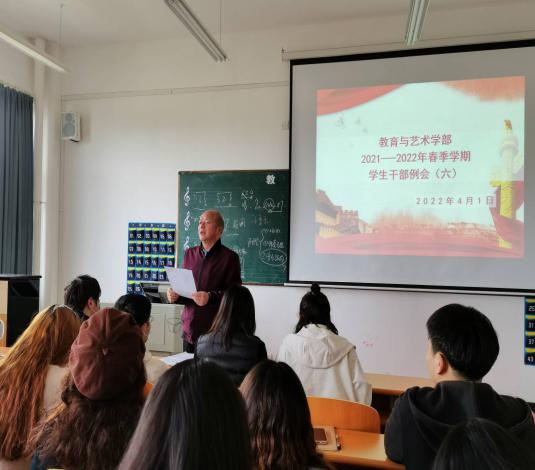 202241日中午1200,教育与艺术学部按照惯例在实验楼1-403多媒体教室组织召开学生干部工作例会。出席本次会议的人员有辅导员、团学会干部及各专业班级班长。会议由党总支书记李先华主持。