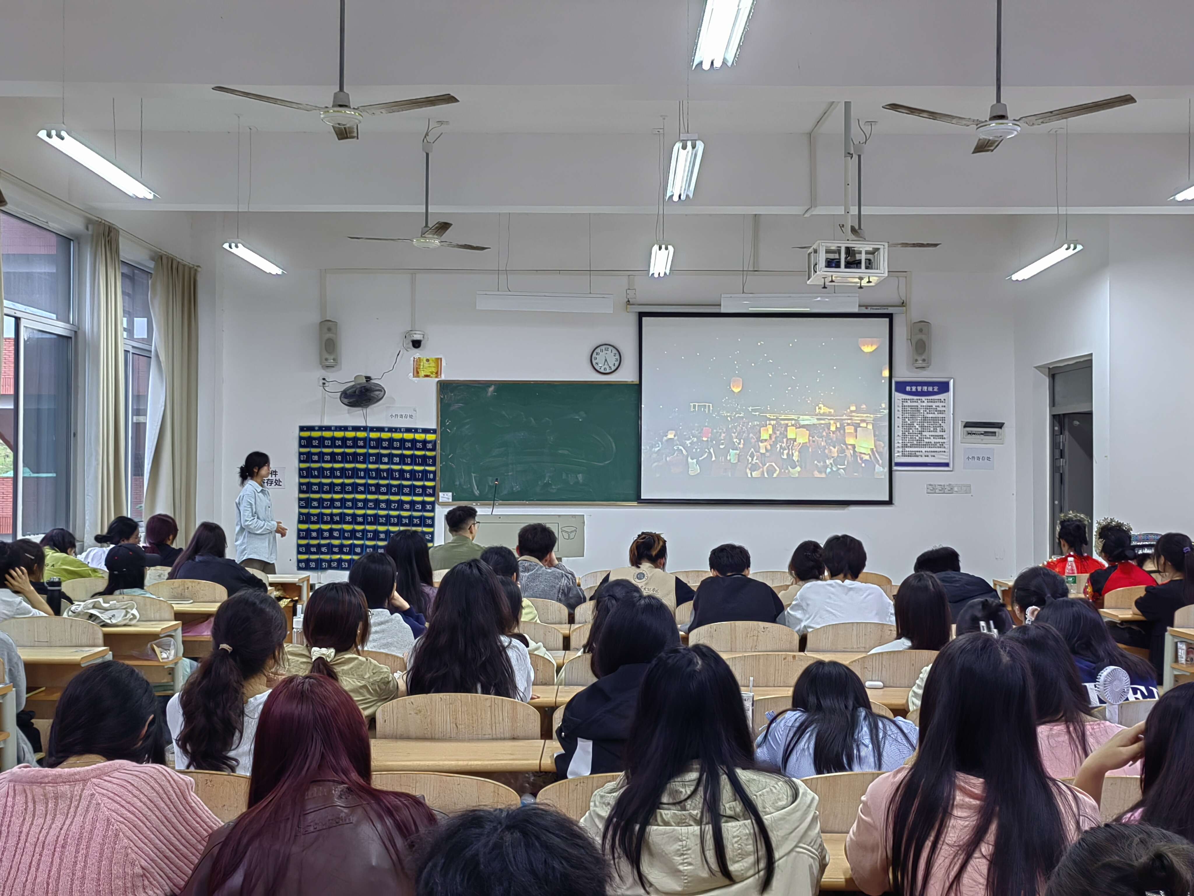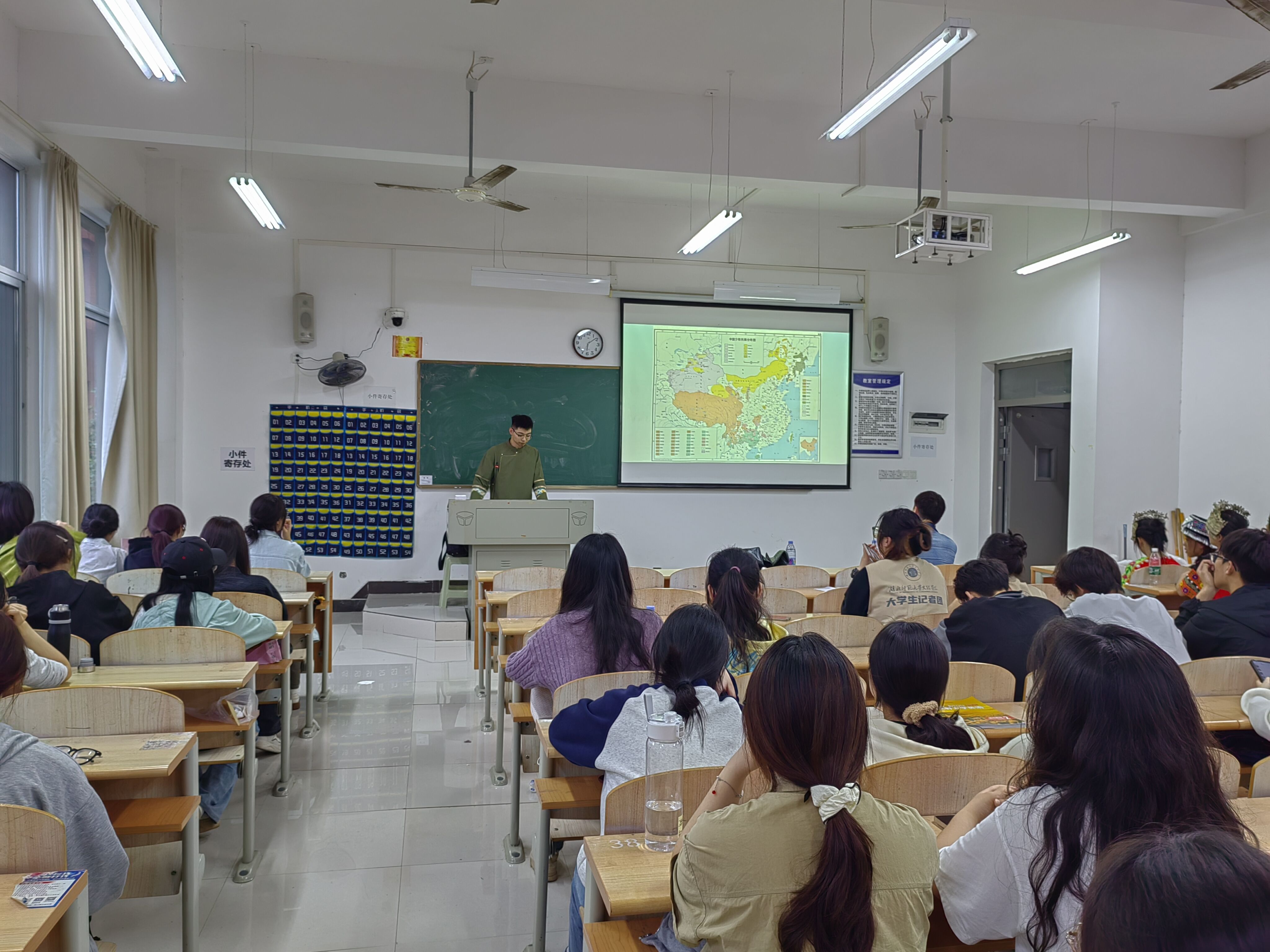 在主题团日中,首先,同学们身着各民族特有的服饰带来了舞蹈《爱我中华》。用特色的民族服饰以及欢快的舞蹈作为本次主题班会的开场。其次,同学们利用PPT的形式向同学们展示了56给民族的文化、及美食,使同学们更全面了解到各民族文化的多样性,在一个又一个民族楷模的动人故事中,让同学们深刻的领会了民族团结的伟大力量。最后,通过趣味横生的互动环节和知识问答,进一步加深了同学们对民族团结重要性的认识。